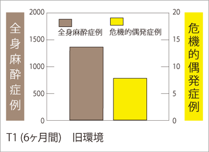グラフは、その一部を抜き出し日本語化したものです。茶色の棒グラフが全 身麻酔症例の数で、黄色の棒グラフが手術中の危機的偶発症例の数です。 T1が以前の環境管理下で麻酔を行っていた半年間の状態で、T2が新管理システム導入後の半年間の状態です。 T2で、麻酔危機的偶発症の発生症例数がほぼゼロになっていることがお分かりいただけると思います。 このように、私たちは世界水準の高い安全性を、手術を受ける患者の皆様に提供しています。 岸和田徳洲会病院では、安心して手術を受けていただけることをお約束します。
